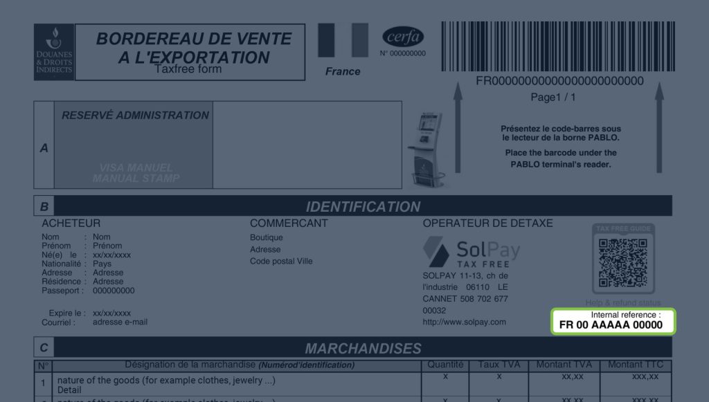 La référence interne se situe sous le QR code, dans le cadre « Identification » de votre bordereau de détaxe.